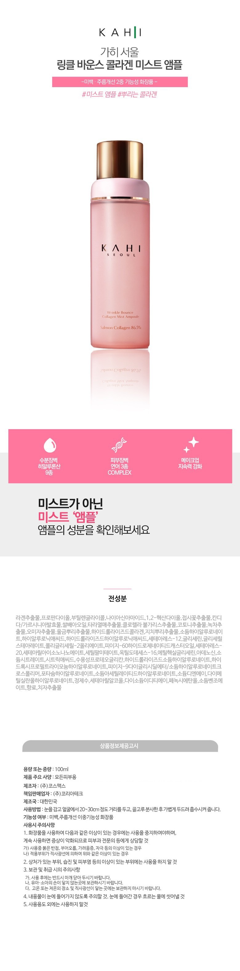 Introducing the KAHI Wrinkle Bounce Collagen Mist Ampoule, your ultimate skincare ally designed to rejuvenate and hydrate all skin types. This revolutionary mist ampoule combines the power of potent ingredients with convenience, ensuring your skin remains youthful and radiant throughout the day.