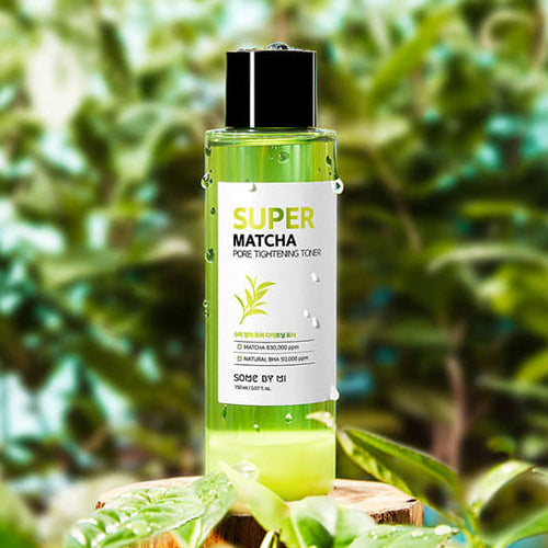 Some By Mi Super Matcha Pore Tightening Toner contains 83% Green Tea water and 5% BHA to tighten, purify, soothe and hydrate skin. Green Tea Leaf extract soothes and maintains sebum levels while its astringent properties help clean and tighten pores. The formula includes a natural BHA, Willow Bark extract to clear out dead skin cells, blackheads & whiteheads as a brew of 4 calming ingredients allows gentle non-irritating pore core. A sebum controller powder layer assists the skin with oil-water balance and absorbs excessive sebum that can clog pores. This product is free of alcohol and recommended for combination and oily skin types.Â